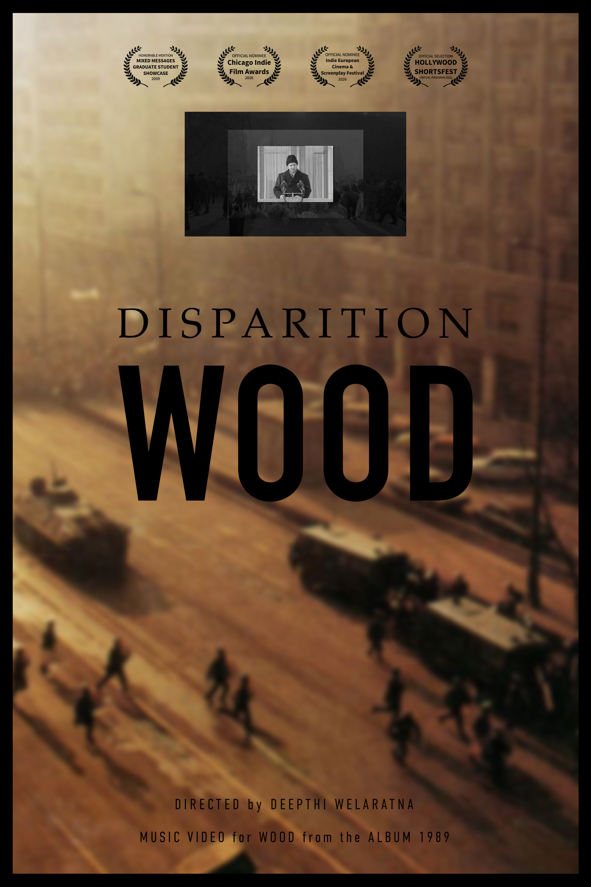“Wood” is a short experimental music video / film based on an original song by Disparition that first premiered in Spring of 2010. The music video extends the conceptual framework of the album 1989 (first released in 2008) into a cinematic form. Where the album constructs a detailed aural narrative of the final days of the Communist era in Eastern Europe, drawing on 1980s-era synthesizer compositions, archival samples from the Romanian Revolution, and modern found sounds, the film translates this approach into image. Through a stark assemblage of found footage from the Romanian Revolution of 1989, “Wood” examines historical collapse, state violence, and the fragility of memory.